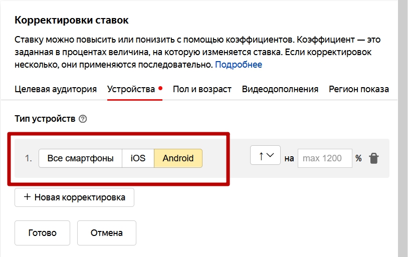 В настройках нужно выбрать условия корректировок. После этого система рассчитается итоговую корректировку для аудитории, удовлетворяющей условиям. В нашем примере мы задали корректировку для пользователей из Московской области −10%, а для пользователей, выходящих с мобильных устройств +50%. В итоге, для пользователей из Московской области, заходящим в интернет с мобильных устройств, мы повысили ставку на 35%.
