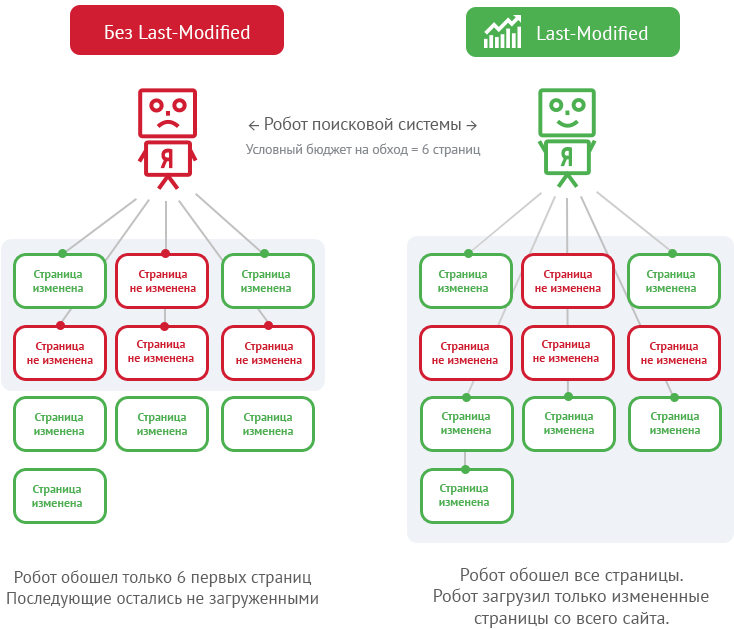 HTTP-заголовок Last-Modified сообщает браузеру или поисковому роботу время последнего изменения страницы. Если браузер или поисковый робот получил заголовок Last-Modified, то при следующем обращении к адресу, при условии, что страница есть в локальном кеше, он добавит вопрос If-Modified-Since (не изменилась ли страница после даты, полученной в Last-Modified). В свою очередь сервер, получив запрос If-Modified-Since должен сверить полученную временную метку со временем последнего изменения страницы и, если страница не изменялась