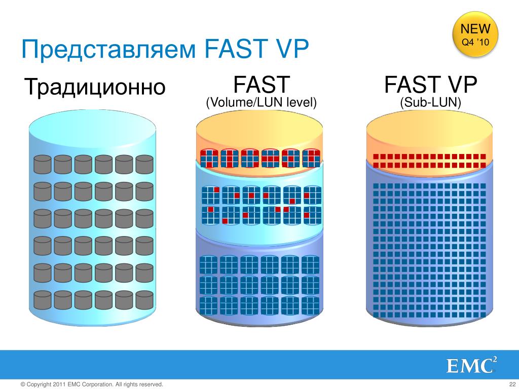 Обычно при создании SAN заказывают массивы с несколькими типами дисков: FC для скоростных приложений, и SATA или SAS для не очень быстрых. Таким образом получаются 2 дисковые группы с различной стоимостью мегабайта — дорогая и быстрая, и медленная и печальная дешевая. На быструю вешаются обычно все базы данных и прочие приложения с активным и быстрым вводом-выводом, на медленную — файловые ресурсы и все остальное.