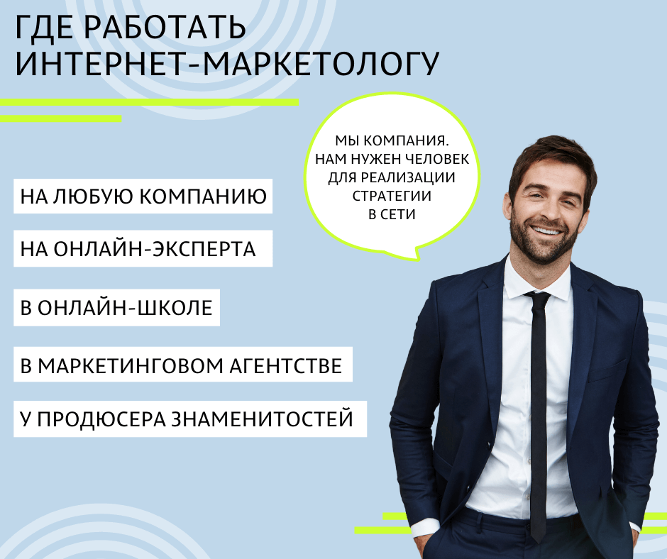 - Интернет-маркетолог. Занимается стратегией продвижения товаров и услуг в интернете.
