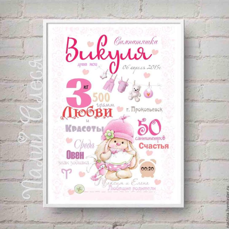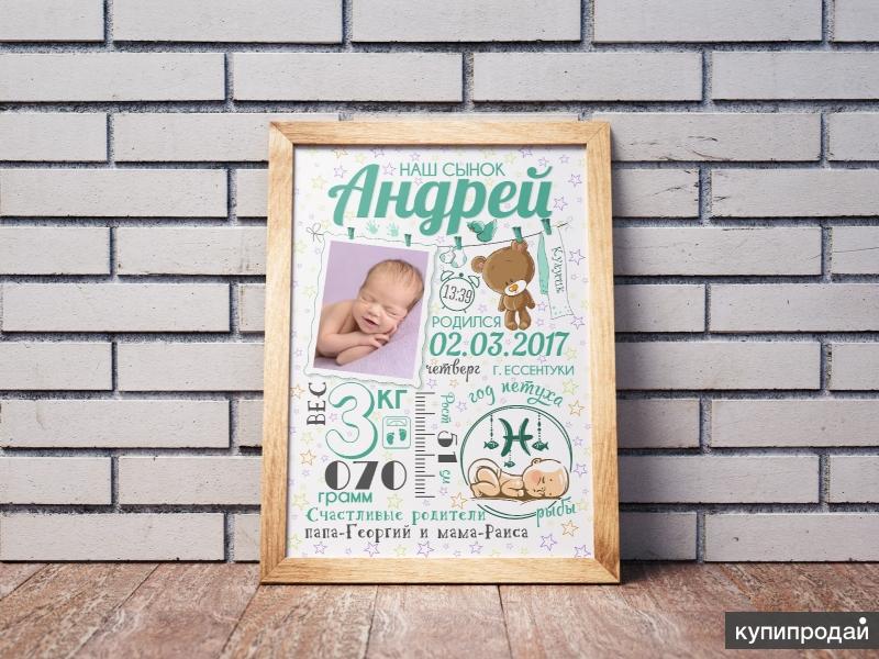 Каждая мама мечтает запечатлеть день рождения своего ребенка как можно ярче. Сегодня для этого существует специальная постер метрика — плакат, на котором отображена основная информация о малыше: его имя, день и время рождения, вес, рост и т. д. Эта красивая вещица становится прекрасным украшением детской комнаты и подчеркивает индивидуальность ее хозяина. Единственный недостаток – как и любое эксклюзивное изображение, метрика предусматривает оплату работы дизайнера.