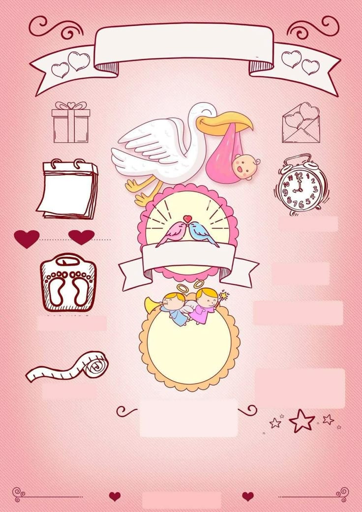 Картинки и фоны для детской метрики могут быть любыми. В оформлении можно использовать фотографии родителей, новорожденного, красивые праздничные изображения или кадры из мультика. Вы также можете разместить снимок УЗИ, бирку из роддома или слепок рук. Также хорошей идеей будет украсить работу клипартами: поместите на лист стикеры с животными, цветами, машинками, аистом.