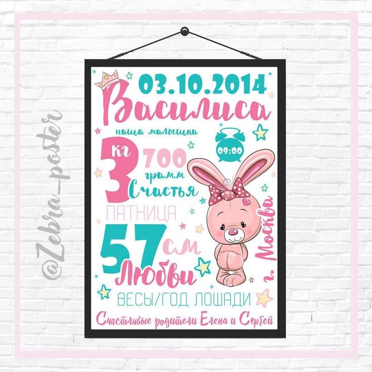 На заметку: Детская метрика – это данные, которые помещают на бирку новорожденного: его имя, дата рождения, вес и рост. Так же метрикой называют декоративный плакат с первым фото малыша и указанием его параметров при рождении. В композицию можно также включить различные милые иллюстрации, украшения, имена родителей, знак Зодиака и т.д. Постер-метрику можно подарить при выписке из роддома или на годик малыша, повесить на стену в детской комнате или выложить в социальные сети.