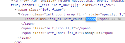 - Далее справа появится код страницы, развернутый на нужном нам элементе. Найдите строку <span class=”inl_bl left_count”>1</span> .