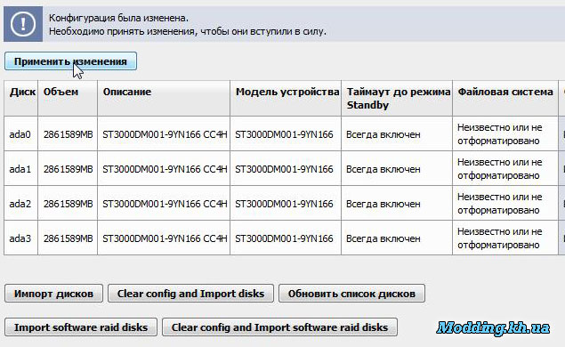 Альтернативно есть кнопка Clear Config and Import Disks. По её нажатии кнопки Система сама определяет какие диски подключены и какой у них формат. Но в этом случае всё равно придётся потом нажать гаечный ключ у каждого из дисков и установить второстепенные параметры.