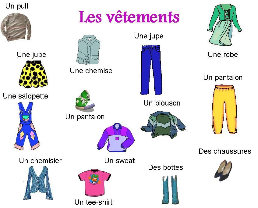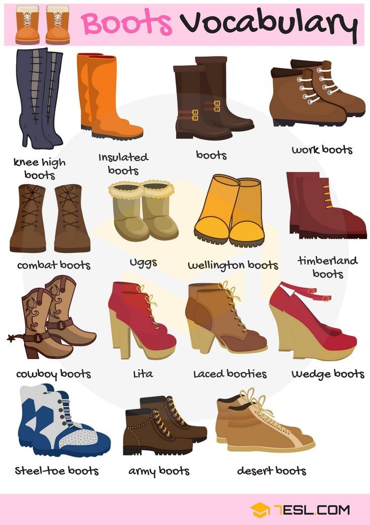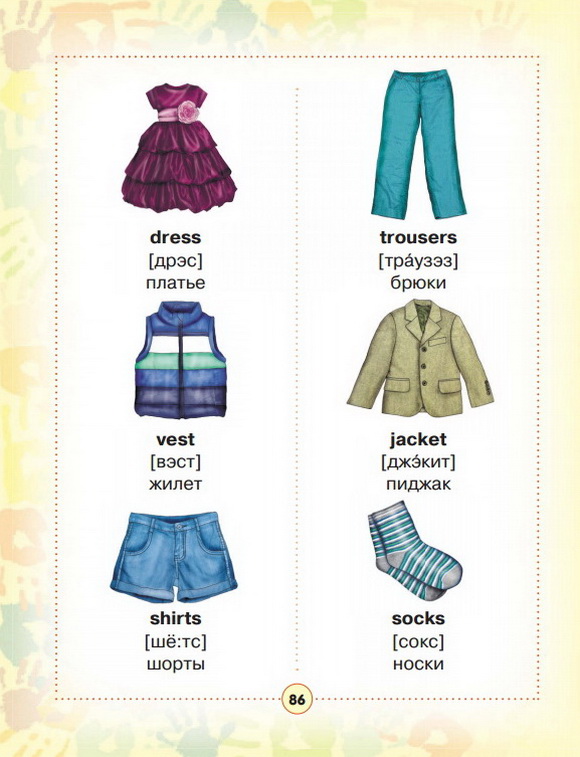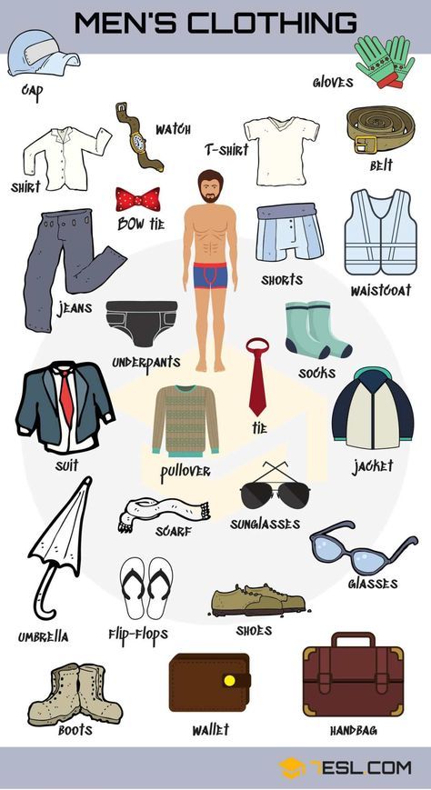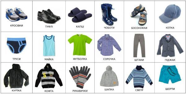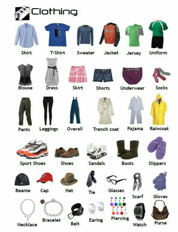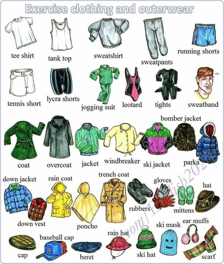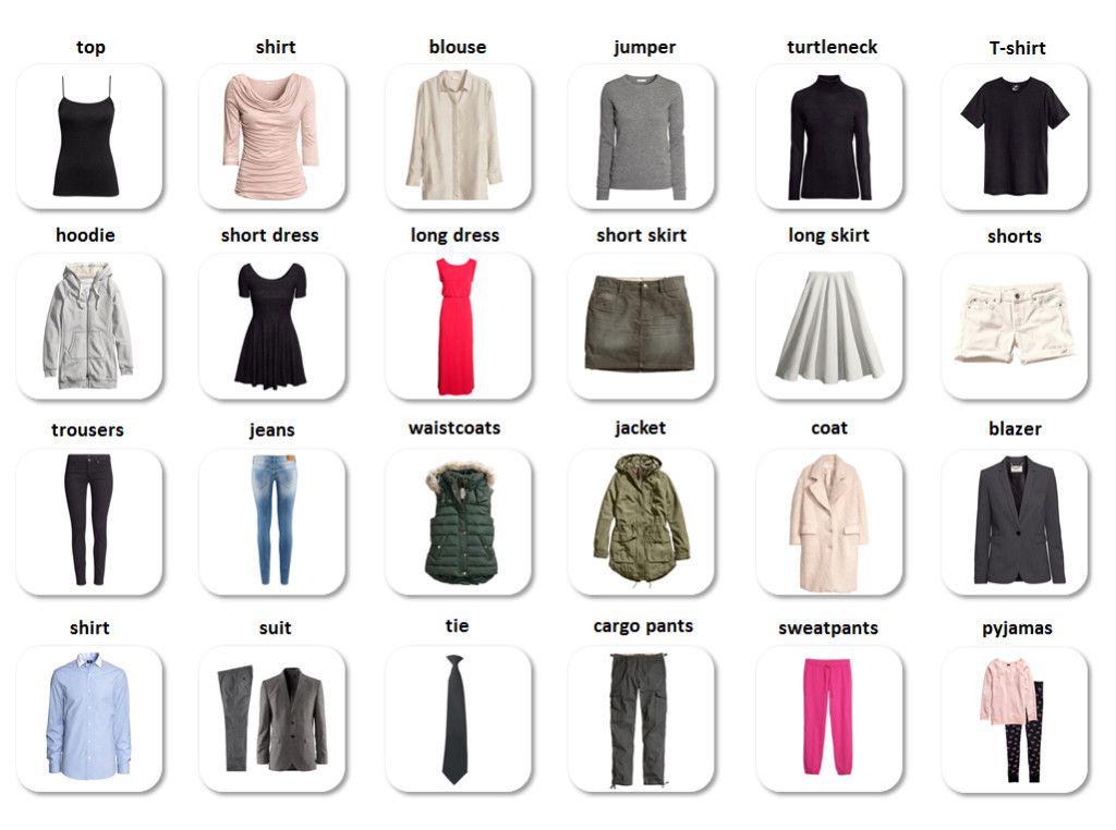 Большой список из наименований одежды , классифицированных по разным категориям с изображениями на английском языке.