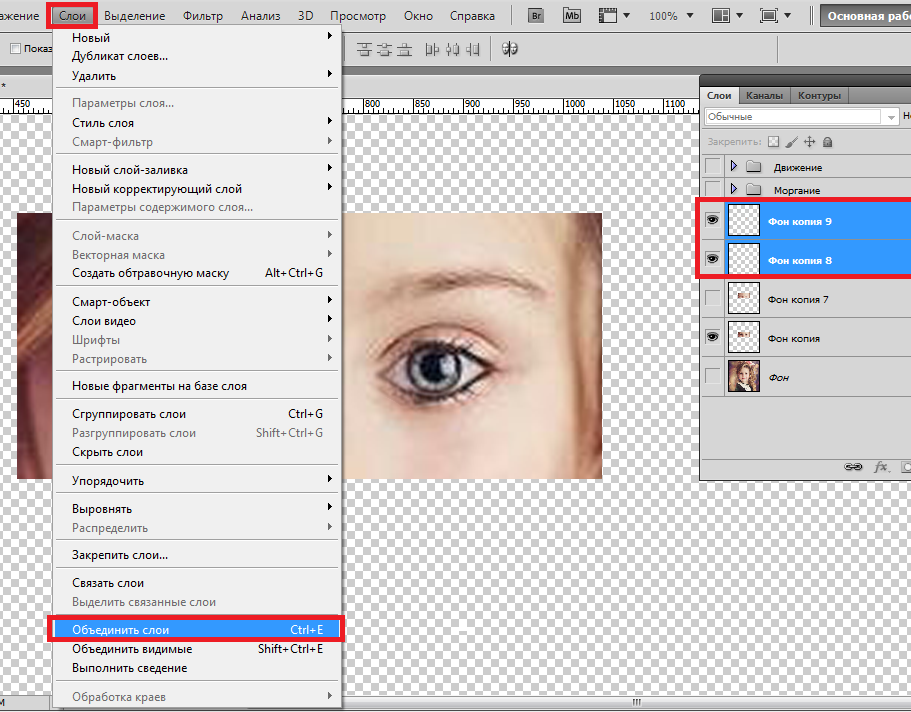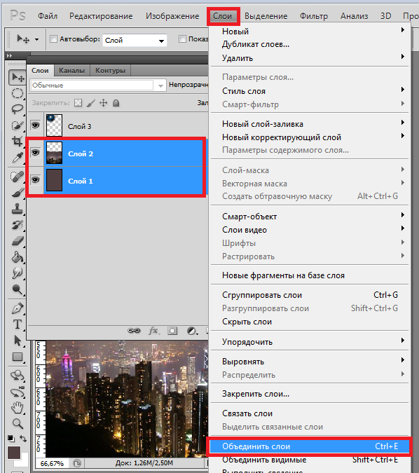 Этот способ является предпочтительным, из-за своей простоты, удобства и универсальности. Такой способ выручает, если нужно склеить слои, находящиеся в разных местах на палитре, вдалеке друг от друга.