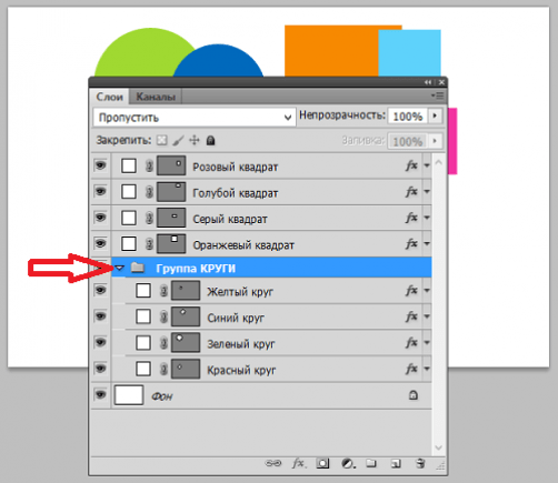 Все слои-круги, действительно, являются членами одной группы, которую мы назвали «Группа КРУГИ». Об этом свидетельствует не только тот факт, что свернув папку, слои-круги вновь в ней «спрячутся», но и некоторое смещение вправо относительно расположения слоёв-квадратов.
