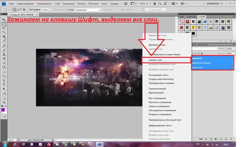 На палитре Layers нажмите [Ctrl] + выберите слои, которые нужно связать.
