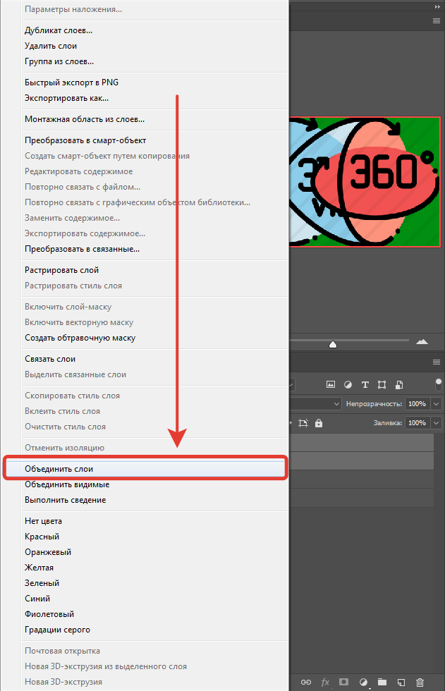 Выберите самый верхний слой из двух слоев, которые вы хотите объединить.