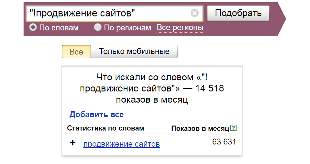 - для получения более точных результатов подбора слов в wordstat.yandex.ru
