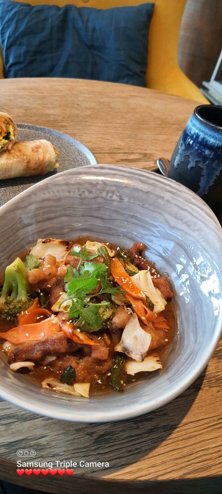 Измельченные овощи и рулетики из тофу w. острый соус..