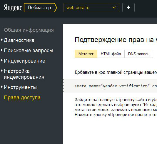 В этом случае вам нужно будет добавить метатег, предоставленный Яндексом, на ваш сайт, чтобы подтвердить, что у вас есть доступ к домену.