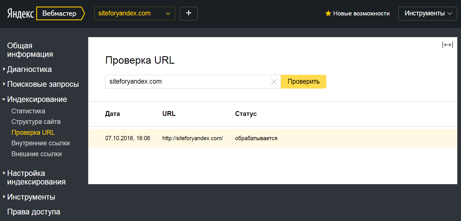 После размещения HTML-файла, метатега или TXT-файла необходимо подтвердить права, нажав кнопку «Проверить». После успешно выполненной проверки вам будут доступны следующие инструменты Яндекс.Вебмастер: