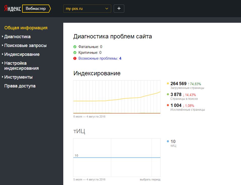 Сведения показываются в урезанном, компактном виде. Если есть желание просмотреть более детальные отчеты, нажмите на заголовок каждого блока в этом разделе, и вы попадете на соответствующую страницу в панели вебмастера. Данных из общей сводки достаточно для экспресс-мониторинга текущего положения дел и отслеживания потенциальных ошибок на сайте.