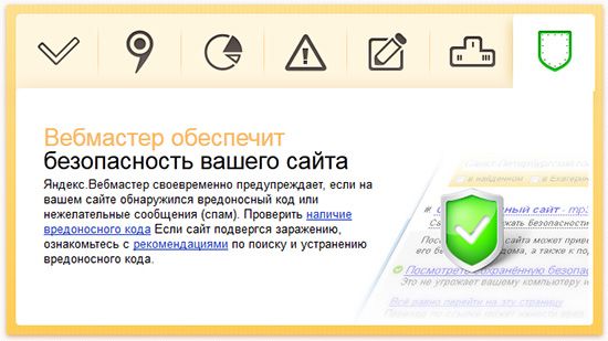 При наличии на вашем сайте вредоносного кода в панели Яндекс.Вебмастера появится сообщение об этом, и в ближайшее время сайт будет исключен из выдачи поисковой системы. Как только сайт будет излечен, необходимо подать заявку на перепроверку в разделе «Безопасность». Если вредоносный код не будет обнаружен, то при следующем апдейте поисковой системы сайт вернется в индекс. Когда с сайтом все в порядке, то в разделе «Безопасность» выводится сообщение: «Вредоносный код на сайте не обнаружен».