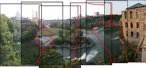 Наиболее распространённый метод, предусматривающий последовательную съёмку участков панорамы обычным цифровым фотоаппаратом с последующим программным объединением в общий снимок высокого разрешения[30]. Готовый снимок может быть двух видов: в цилиндрической проекции, как в аналоговой фотографии с поворотным объективом, или в сферической, пригодной также для использования в устройствах виртуальной реальности. Чтобы свести к минимуму ошибки совмещения при склеивании, съёмка должна вестись фотоаппаратом, закреплённым на специальной штативной головке, поворачивающей камеру вокруг входного зрачка объектива. Это позволяет исключить параллакс близких предметов из-за смещения точки съёмки при повороте фотоаппарата[30].