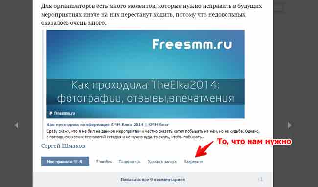 Закреп в сообществе работает аналогично – пост поднимается выше и остается там, пока его не открепят.