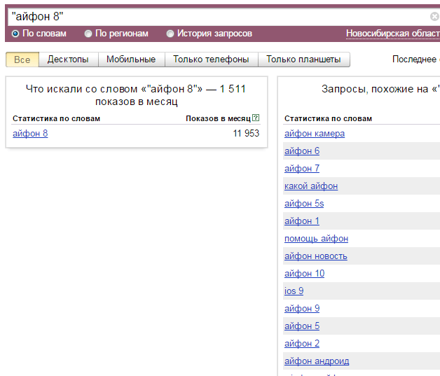 Вордстат — это штука, по которой можно посмотреть, какие слова вводят и какая у них частота. Но я пользуюсь прогнозом бюджета — это по факту тоже самое, но там можно слова сохранять.