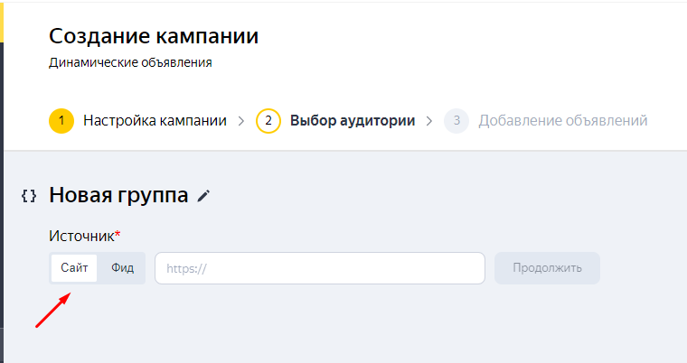 Дальше выберите источник таргетинга — то есть как системе определить, на основе каких страниц создавать объявления: