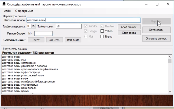 Для примера возьмем запрос «доставка воды». Вводим его в поле «Ключевая фраза», выбираем значение параметра «глубина парсинга», регион, поисковики, которые будет парсить — и нажимаем кнопку «Парсить».