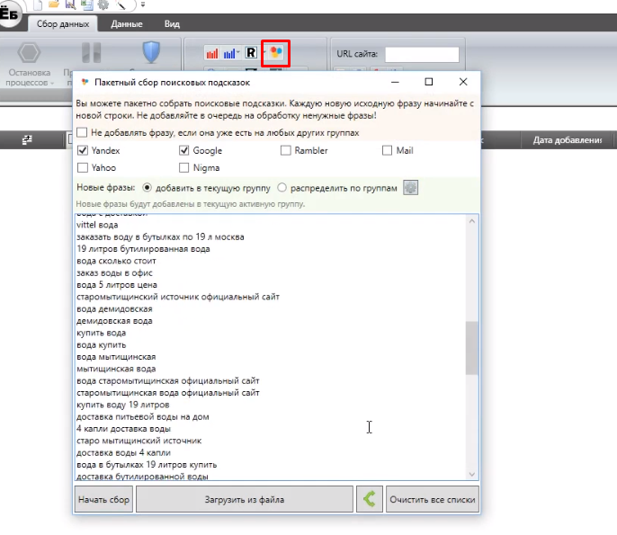 Нажимаем кнопку «пакетный сбор поисковых подсказок», в появившееся окно вбиваем наши запросы.