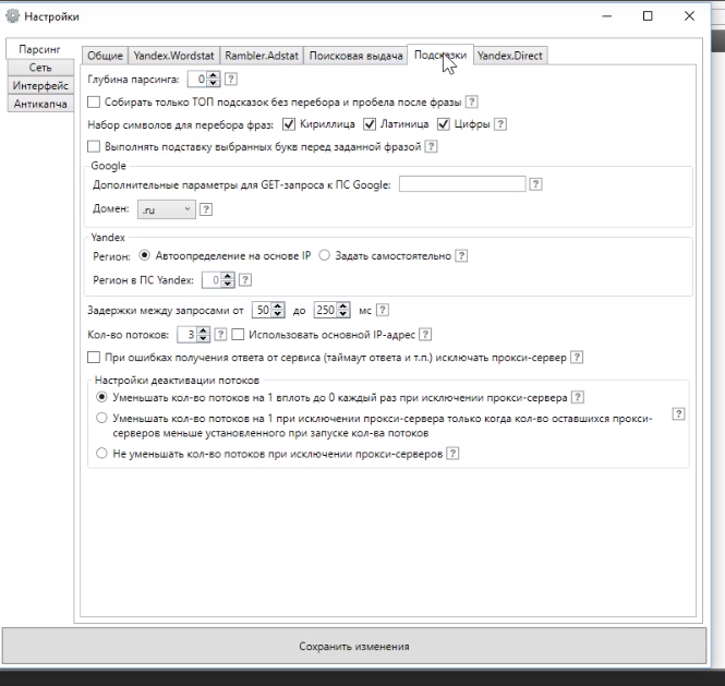 Зайдем в «Настройки/Парсинг», вкладка «Подсказки» и рассмотрим, какие параметры можно установить.