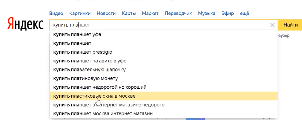 Когда мы в поисковой строке Яндекса вбивали свой запрос — «пластиковые окна» — нам выдавались подсказки «пластиковые окна в москве», «пластиковые окна купить» и т.д. Но можно набрать основной запрос, поставить пробел и начать набирать следующее слово — и поисковик предложит нам варианты продолжения запроса. Например, если набрать «пластиковые окна й…» — будет одни варианты подсказок; «пластиковые окна 1…» — другие.