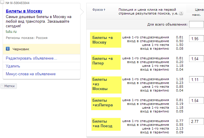 - Иногда объявление может не попасть на первую страницу даже при соответствии фактической и оценочной ставок.