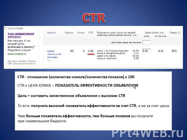 - рейтинг объявления (и показатель CTR – кликабельность — скажем равный или более 2%), т.