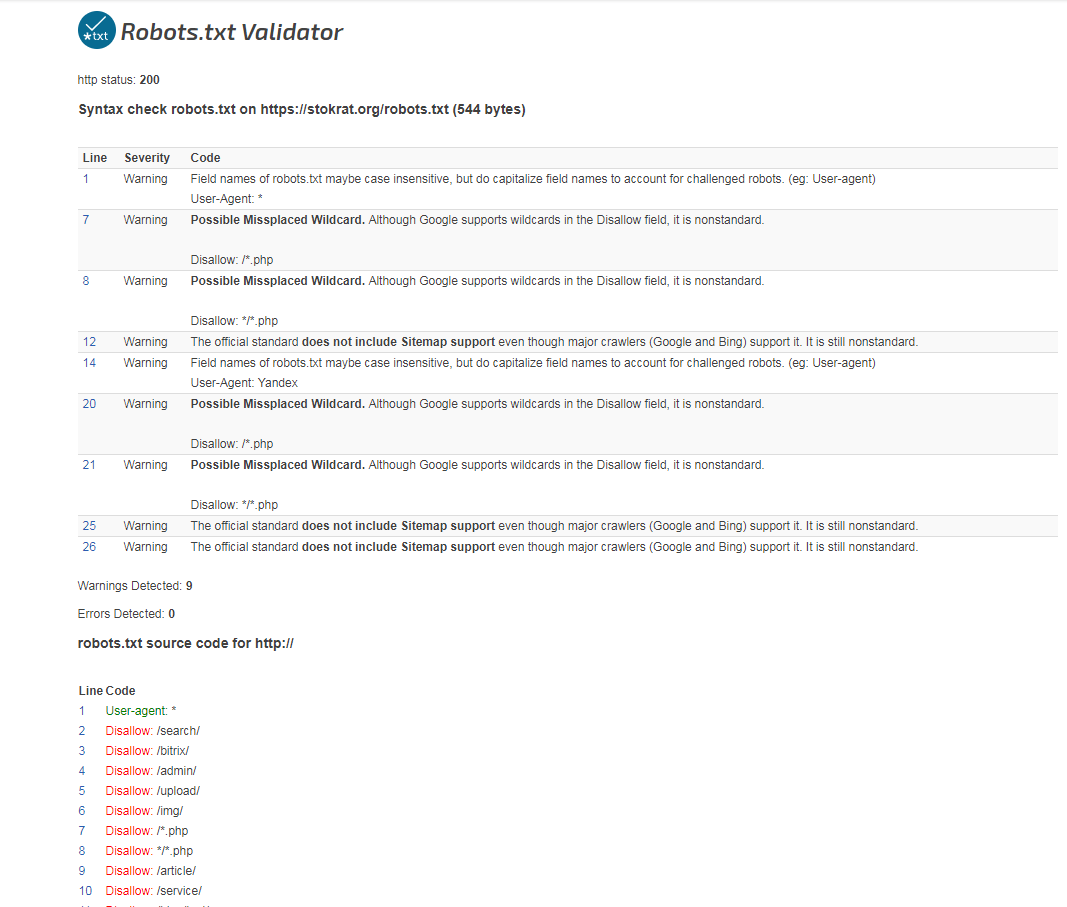 Рекомендуется проверять файл robots.txt в специальных сервисах, например, Yandex, Google.