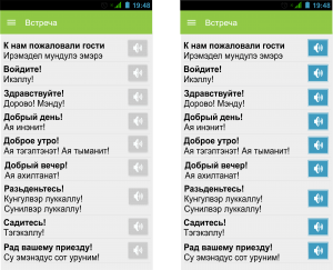 Пользователь переходит в тему Разговорника, нажав на нее. Здесь в окне содержимого находятся фразы на русском языке, ниже которых располагается их перевод на эвенкийский язык. Есть возможность прослушать фразу на эвенкийском языке с помощью нажатия на кнопку, находящуюся рядом. При нажатии на кнопку, она становится активной и меняет свой цвет с серого на синий. Пользователь может также содержимое окна вверх и вниз.