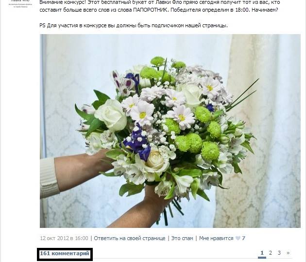 Повышают охваты постов не только лайки и репосты, но и комментарии. И на мой взгляд, если и проводить конкурсы, то эффективнее всего это делать через комментарии. Самый распространенный вариант, когда победителем становится тот человек, чей комментарий дольше всего “провисел” последним под постом.