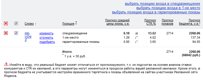 Π ΡΠ΅Π·ΡΠ»ΡΡΠ°ΡΠ΅ ΠΏΠΎΠ»ΡΡΠ°Π΅ΡΡΡ ΡΠ°Π±Π»ΠΈΡΠ° Ρ ΠΊΠ»ΡΡΠ΅Π²ΡΠΌΠΈ ΡΠ»ΠΎΠ²Π°ΠΌΠΈ, ΡΠ°ΡΡΠΎΡΠ½ΠΎΡΡΡΡ ΠΈ ΠΏΡΠΎΠ³Π½ΠΎΠ·Π°ΠΌΠΈ ΡΡΠ΅Π΄Π½Π΅ΠΉ ΡΠ΅Π½Ρ ΠΊΠ»ΠΈΠΊΠ°, ΡΠΏΠΈΡΡΠ²Π°Π΅ΠΌΠΎΠΉ ΡΡΠΌΠΌΡ, CTR, ΠΊΠΎΠ»ΠΈΡΠ΅ΡΡΠ²Π° ΠΊΠ»ΠΈΠΊΠΎΠ² Π² ΠΌΠ΅ΡΡΡ ΠΈ Π±ΡΠ΄ΠΆΠ΅ΡΠ°. Π§ΡΠΎΠ±Ρ ΡΠΏΡΠΎΠ³Π½ΠΎΠ·ΠΈΡΠΎΠ²Π°ΡΡ Π±ΡΠ΄ΠΆΠ΅Ρ ΡΠ΅ΠΊΠ»Π°ΠΌΠ½ΠΎΠΉ ΠΊΠ°ΠΌΠΏΠ°Π½ΠΈΠΈ, Π²ΡΠ±Π΅ΡΠΈΡΠ΅ ΠΏΠΎΠ΄Ρ ΠΎΠ΄ΡΡΠΈΠ΅ ΡΠ»ΠΎΠ²Π° ΠΈ ΠΊΠ»ΠΈΠΊΠ½ΠΈΡΠ΅ Β«ΠΠΎΠ±Π°Π²ΠΈΡΡ Π² ΠΌΠ΅Π΄ΠΈΠ°ΠΏΠ»Π°Π½Β».