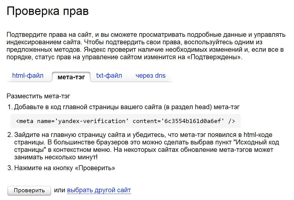 - Подтвердите права, что вы являетесь владельцем сайта. Скопируйте предложенный сервисом мета-тег и добавьте его в код страницы в раздел <head></head>.