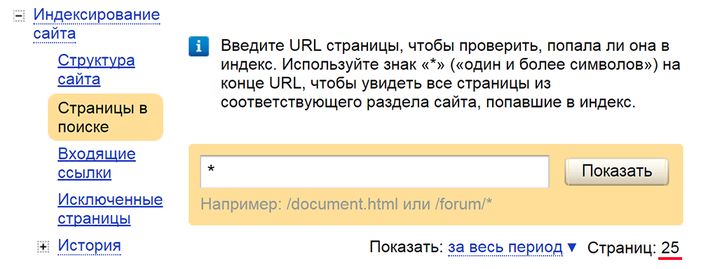 Такой метод позволяет увидеть, сколько URL-адресов попало в индекс, и отследить динамику.