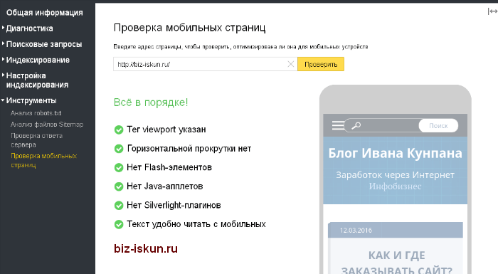 Вебмастер проверяет и сразу показывает, корректно ли ресурс отображается на мобильных устройствах. Нет ли на нём факторов, создающих проблемы для браузеров планшетов и смартфонов.