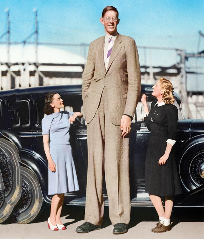 Роберт Першинг Уодлоу, родившийся 22 февраля 1918 года, был и остается самым высоким человеком в мире при росте 8 футов 11 дюймов. Уодлоу весил 439 фунтов. а также обладатель титула «Самые большие руки в мире» с ростом 12,75 дюйма и «Самые большие ноги в мире» с размером 18,5 дюйма. Размер кольца Уодлоу был 25, а размер его обуви — 37 AA для мужчин, которые должны были быть изготовлены на заказ.