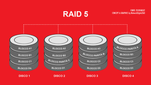 RAID 5 использует как минимум три жестких диска и распределяет данные между несколькими жесткими дисками для повышения производительности за счет одновременного доступа, но, в отличие от RAID 0, RAID 5 включает корректирующие коды (биты четности) между данными.