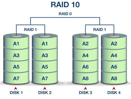 RAID 10 или RAID 1 + 0 — это комбинация системы RAID 1 и системы RAID 0. RAID 10 состоит как минимум из 4 единиц хранения и отличается повышенной надежностью. В RAID 5 один неисправный диск не теряет данные, но если два диска выходят из строя, данные теряются. При использовании RAID 10 в случае отказа диска вся система остается работоспособной, а целостность данных сохраняется. RAID 10 отвечает требованиям надежности, но также и высокой производительности.