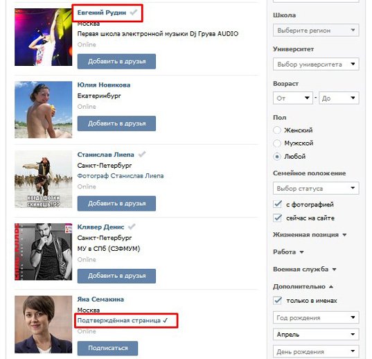 Рядом с некоторыми именами стоят галочки, что они означают? Это говорит о том, что аккаунт подтвержден официально. То есть человек заморочился, отправил фотку со своими документами в техническую поддержку Вк и доказал что он тот, кем назвал себя.