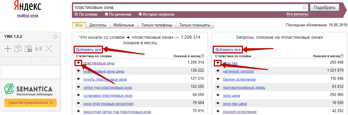 Логика работы инструментаИнструмент собирает частотность по запросам из левой и правой колонок. В интерфейсе https://wordstat.yandex.ru/ это выглядит так: