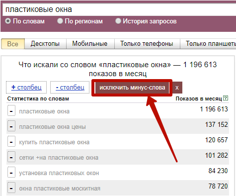 • — оператор «Минус» — знакомый многим оператор, поможет вам избавиться от стоп-слов и получить только нужные запросы.