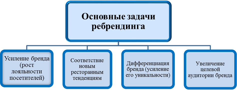 К основным задачам ребрендинга можно отнести: усиление бренда, которое подразумевает рост лояльности потребителей; дифференциацию бренда, то есть усиление его уникальности; увеличение целевой аудитории бренда путем привлечения новых потребителей [2].