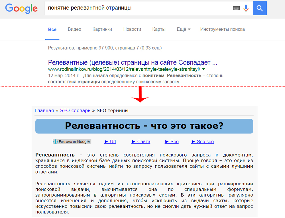 Релевантность страницы поиска — это то, насколько результат поиска соответствует ожиданиям человека. Синоним релевантности — это адекватность выдаваемой поисковиками информации.