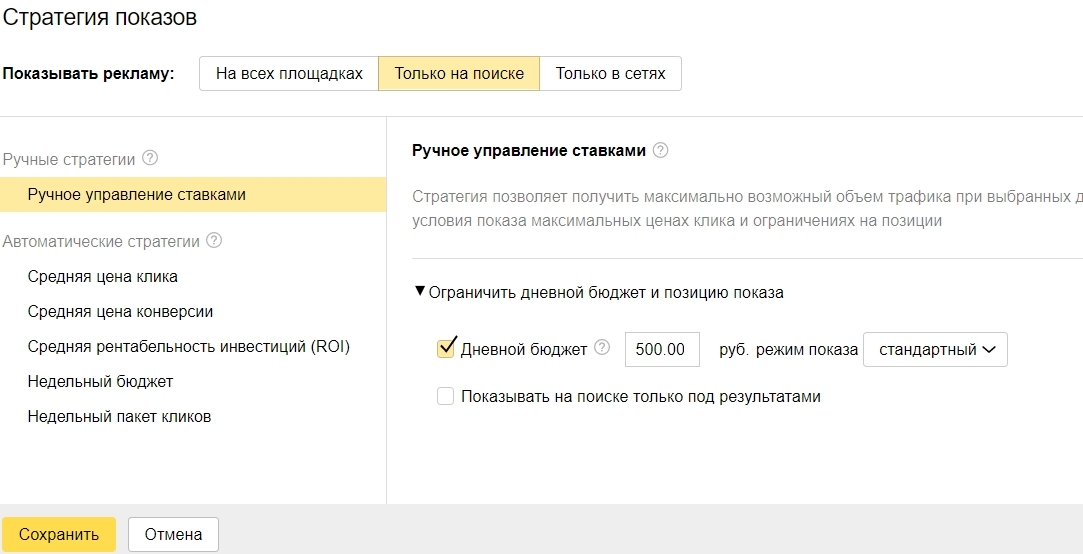 Для этой стратегии доступны три варианта, в зависимости от того, где вы хотите, чтобы ваша реклама отображалась в результатах поиска: