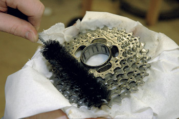 Сними кассету и обильно полей ее смывкой для смазки. Потом возьми щетку и хорошенько пройдись по ней. Обрати внимание на лапки паука (на которых закреплены звездочки). Именно там чаще всего прячется грязь. Внимательно осмотри корпус трещетки. Если он заржавел, почисти его и спрысни маслом из баллончика. Поставь кассету на место.