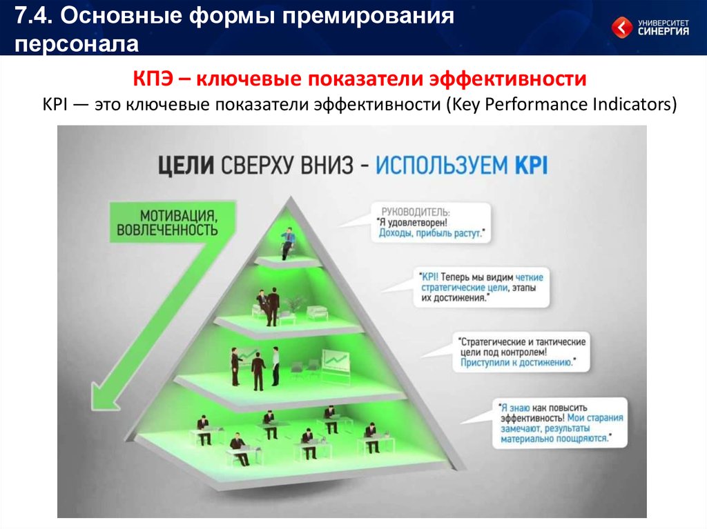 KPI (Key Performance Indicators) — система показателей, с помощью которой работодатели оценивают своих сотрудников. Она имеет много общего с обычным плановым подходом. С одним серьезным отличием: показатели работы каждого отдельного сотрудника привязывают к общим KPI всей компании (таким, как прибыль, рентабельность или капитализация). Цель системы — сделать так, чтобы действия сотрудников из разных служб не были противоречивыми и не тормозили работу специалистов из других подразделений. Каждый вносит вклад в общее дело, работает на достижение стоящих перед ним целей и в результате получает бонусы за их выполнение.