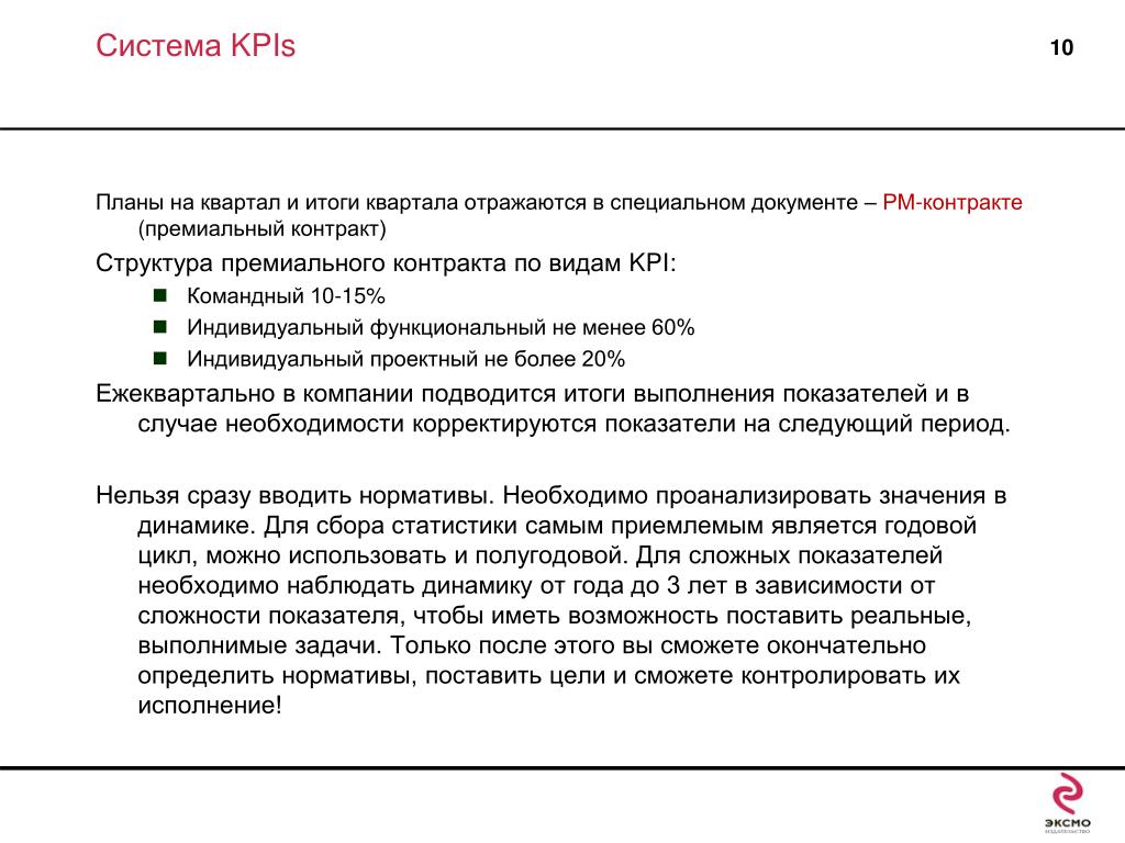 И еще. Нужно учитывать, что планирование и расчеты KPI отнимают время. Начальник отдела логистики транспортной компании Роман недоволен тем, что введение этой системы обернулось для него дополнительными часами работы. «Теперь по окончании каждого месяца мне приходится тратить время на выставление и подсчеты KPI всех своих подчиненных. Все показатели приходится согласовывать с дирекцией по персоналу. При этом за вычисление размеров бонусов премию мне не доплачивают», — жалуется он.
