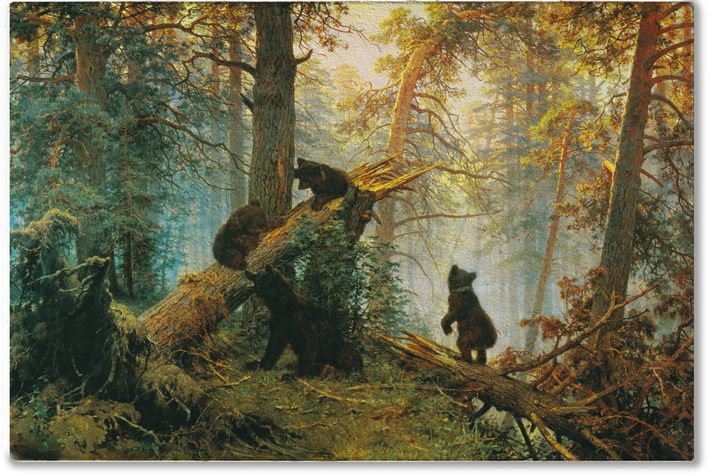 Одной из самых известных нам картин Ивана Шишкина является «Утро в сосновом лесу». Причина такой популярности вполне объяснима, так как даже сегодня знаменитых мишек можно увидеть на обертках конфет «Мишка косолапый» фабрики «Красный Октябрь». Картину печатали в учебниках, вышивали на коврах, а репродукции с этим сюжетам и сегодня висят во многих заведениях культуры, так как фактически картина для многих стала символом искусства.